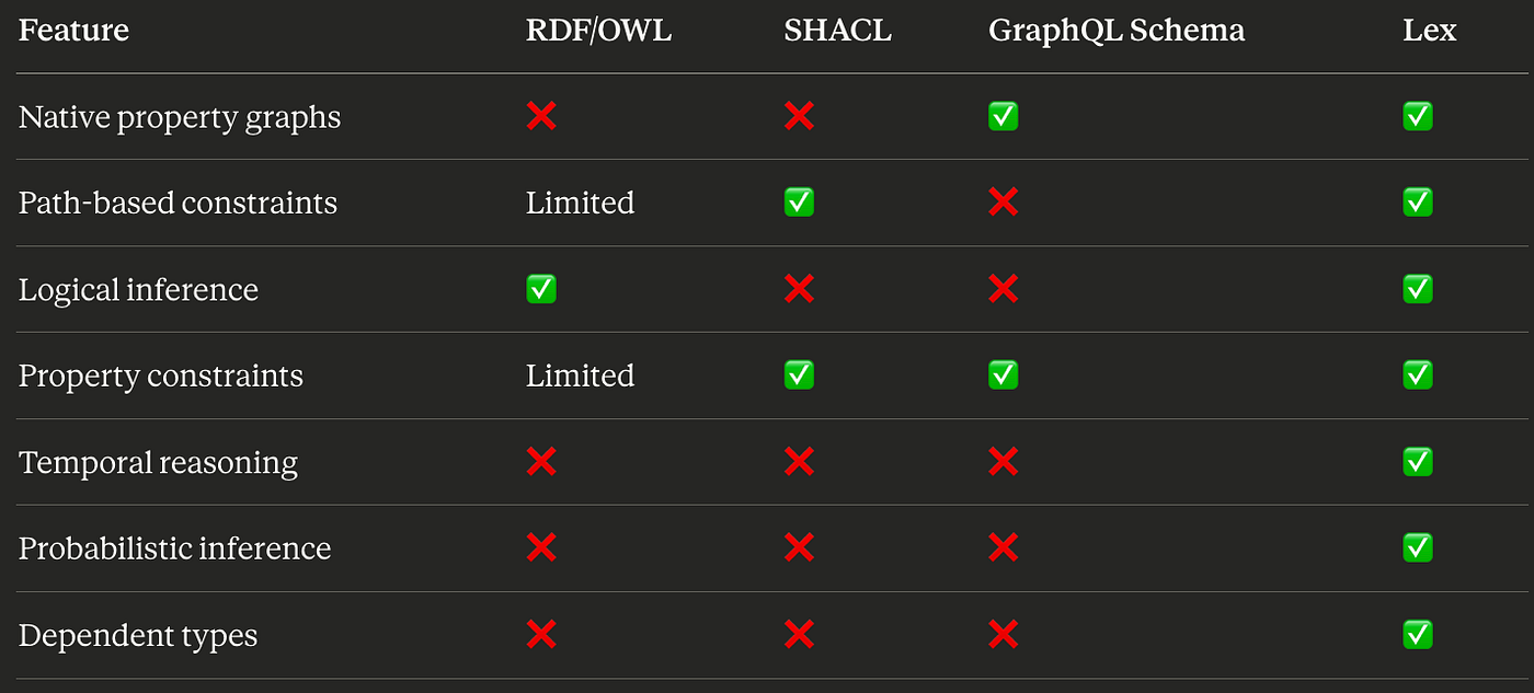 RDF/OWL provided these capabilities but forced everything into subject-predicate-object triples, making it awkward to represent multi-property relationships. Lex bridges this gap.